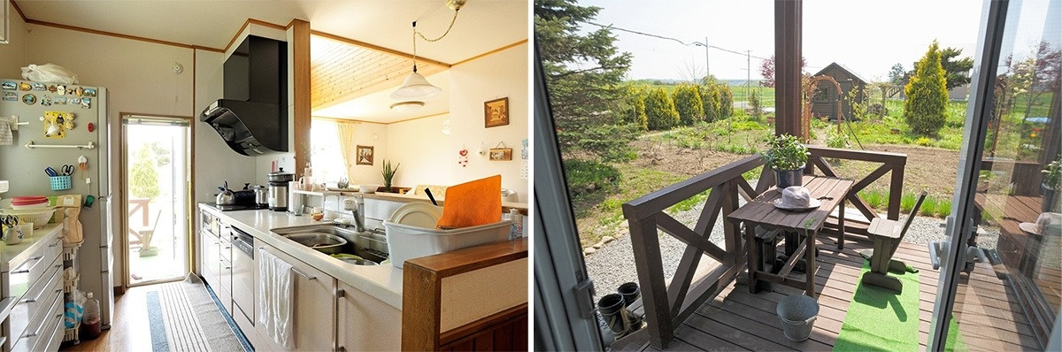 こちらはキッチン。そしてキッチン横にあるドアを出るとそこには木製のバルコニーとテーブルが。菜園で収穫された新鮮なお野菜が、朝の食卓に並びます。「東川町での暮らしに不満は全くありません。庭は当初はイングリッシュガーデン風を考えていましたが、広い庭に好きなものを植えるうちに自然いっぱいのホッとする庭になりました。家庭菜園も楽しくて贅沢な生活かなと思います」と笑顔がこぼれます。
