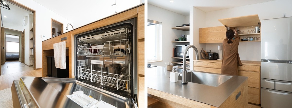ミーレの食洗器も内蔵。60センチ幅の大容量で、扉が全開になるので大容量の食器を一気に洗うことができます。「お鍋なども入れられるし、汚れ落ちもよいので、家事の手間が減ってうれしいです」と奥様。カップボードなどの収納スペースも調理の段取りなどを踏まえてプランニング。