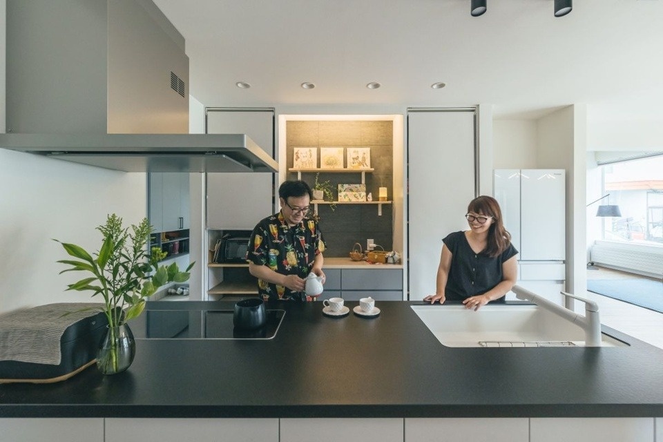仕事で料理を撮影することも多いというフォトグラファーの萬田さん。自分で作った料理の撮影も楽しみたい、ということで料理が引き立つグレーを基調としたお部屋も作りました。釣り道具などもどう飾ろうかと思案中です。家族や友人を招いて、食事を楽しむカウンター。プロ仕様のキッチンでは、本格的な料理を楽しめます。釣りや料理など趣味を楽しむ暮らしに、今からワクワクが止まらない様子です。