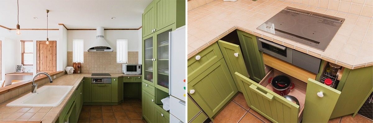 キッチンに入るとまず目に飛び込んでくるのが、みずみずしい若草色です。やさしい色合いのタイルともマッチした心弾むような配色は「来てくれた人によく〝癒やされる〟と言われます」(奥様)。「家族皆で並んで料理がしたい」と、広々としたL字型のキッチンにしました。