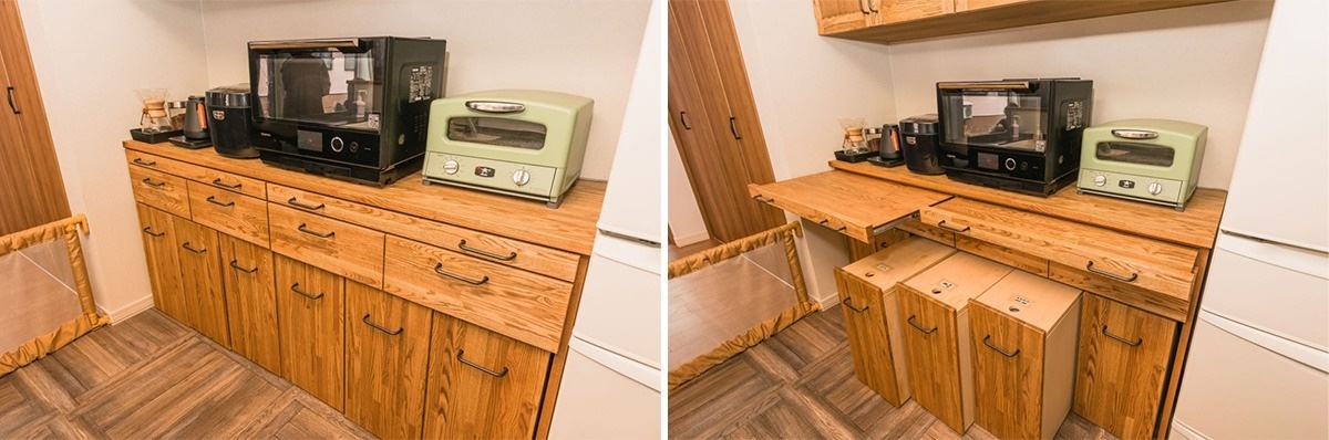 こちらの棚もサイズや仕様など、お母様のもつイメージにぴったり合わせて作られました。上は引き出し式の作業台。調理中もキッチンが広々と使えます。下にはゴミ袋やお米のストックを入れられるようになっており、指で引っかけて蓋を持ち上げる仕組みです。