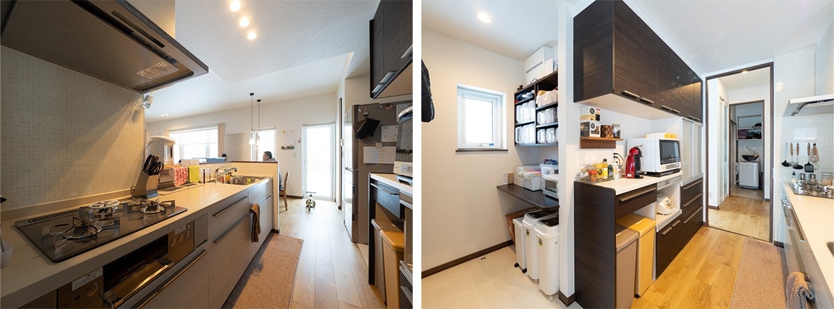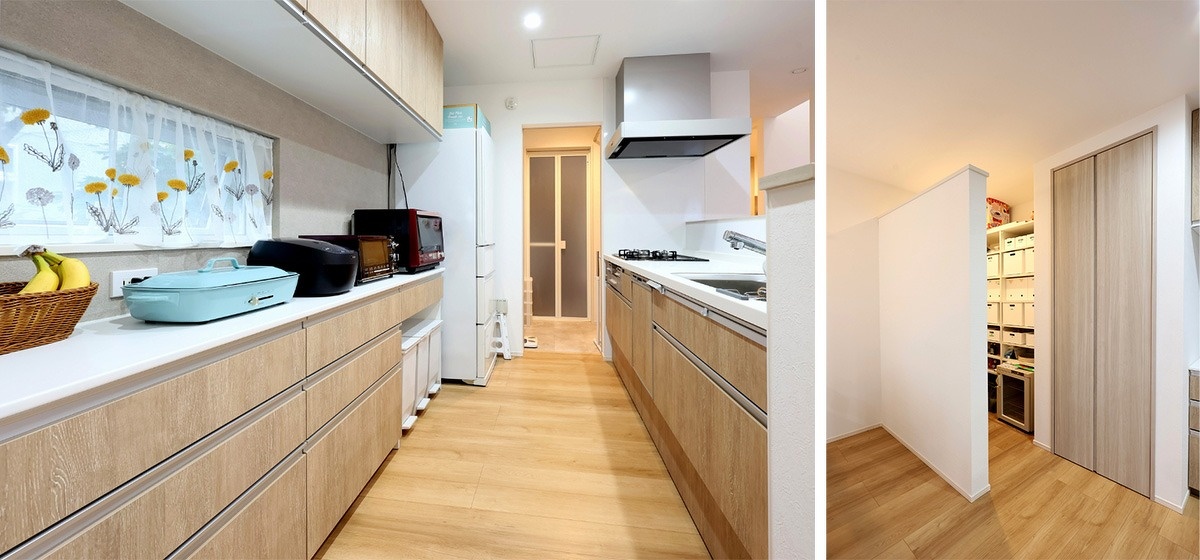 キッチンの背面収納のそのさらに裏側に、調味料や食材などを保存できる常温型のパントリー(食品庫)を設置。キッチンを綺麗に整頓できる工夫です。