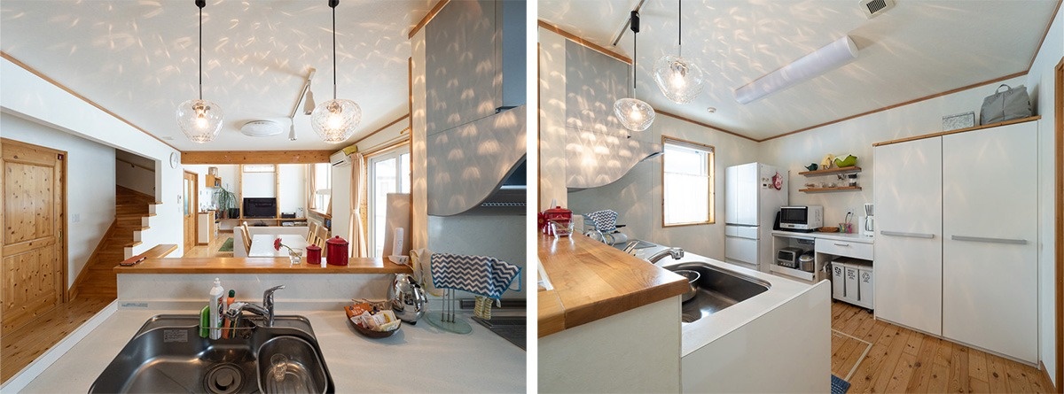 キッチンは「以前の家はキッチンが個室で寂しかったので、リビングにいる家族のほうを向いて料理ができるように」という奥様のたっての希望で対面型に。キッチンは造作。背後の収納棚は、大工さんの手づくりで、オーナーの手持ちのキッチンツールに合わせたぴったりサイズです。棚を低めの位置にするために窓は特注。台に登らなくても物を取れます。アンティークガラスも奥様お気に入り。シンクと、窓側についたガスコンロの間の空間も、作業や移動がしやすい距離にこだわりました。作業スペースも広いので、近い将来、お子さんと並んでお料理もできそうです。照明の位置も工夫されており、通常の立ち位置の真上から少しずらしているので、手元が陰になりません。