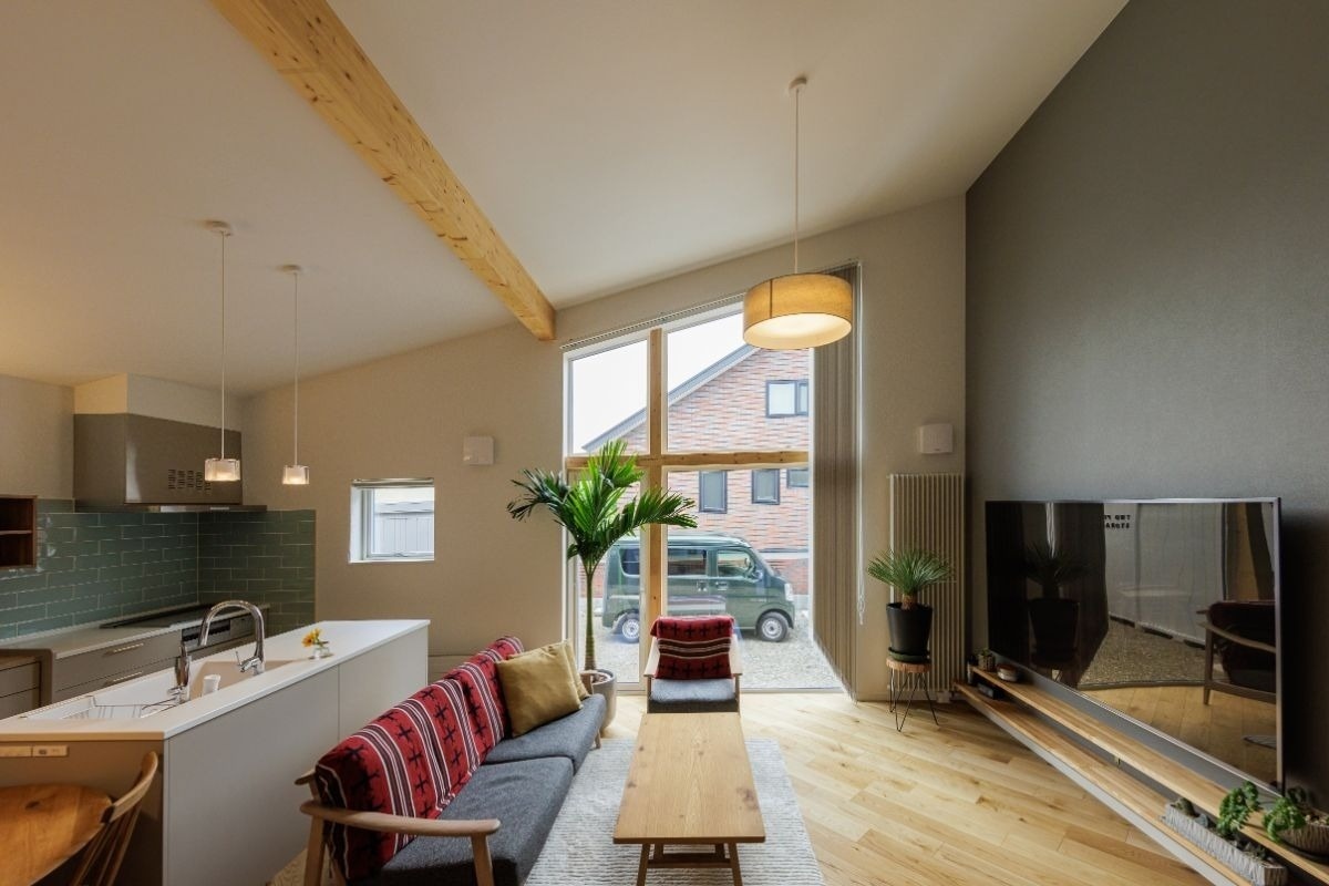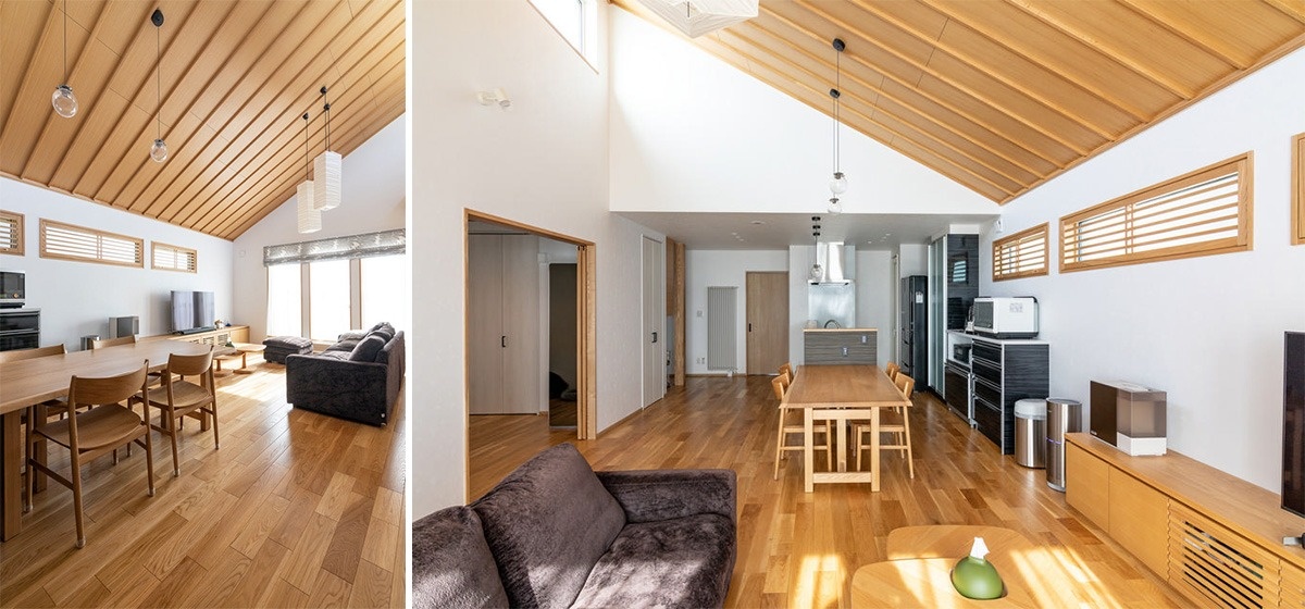 勾配天井に大きな窓、空間の広がりを重視したLDK 池田町O邸/赤坂建設