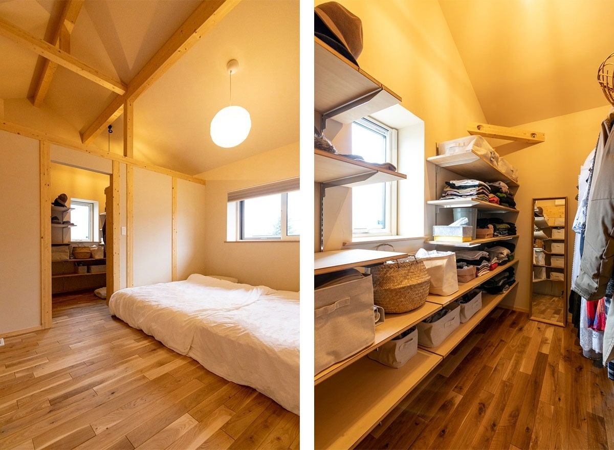 主寝室は屋根なりの勾配天井で開放感が抜群です。電球色の色味が塗壁にやさしく照り返され、癒される空間です。奥には大収納のウォークインクローゼットを確保しています。