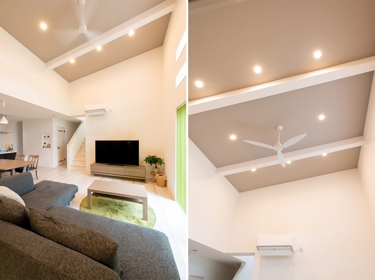 十分な採光があるため、吹き抜けの斜め天井には、照明が一切ありません。「スッキリとしたデザインでとても気に入っています」とMさんは話します。