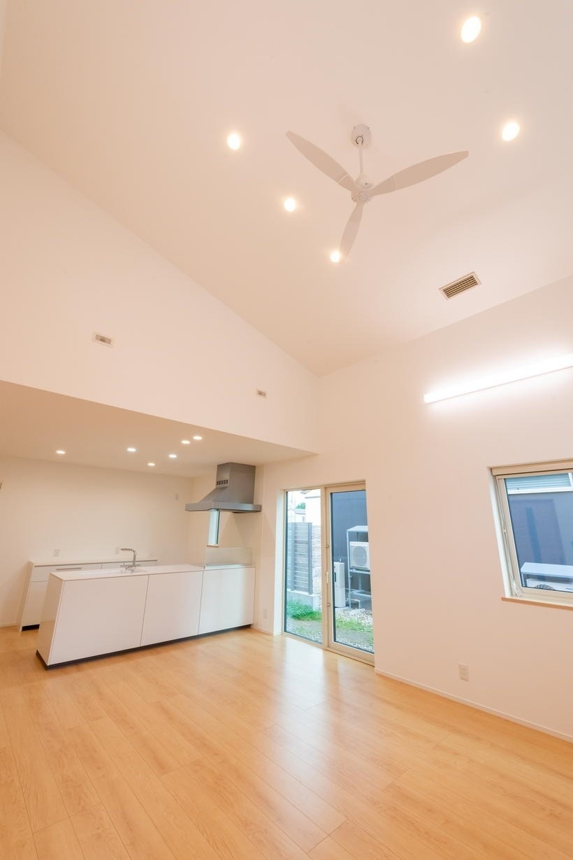16畳のLDK。屋根勾配を生かした天井の高さは最高部で約3.8m、面積以上の開放感があります。