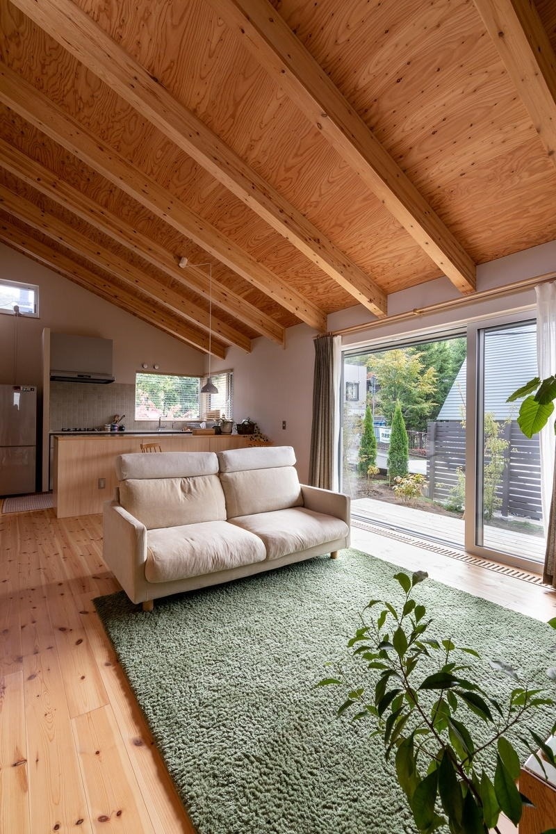 天井を現しにすることで、木の質感をプラス。パインの無垢フローリングともマッチしています。ワイドなテラス窓には、トリプルガラス入りの高性能サッシを採用しています。