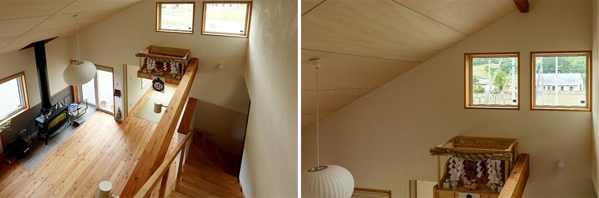 片流れ屋根なので、2階の居室は天井が屋根なりに傾斜になっています。床材と同じくトドマツの板張りで、屋根裏部屋の楽しさを感じます。針葉樹の床材は柔らかく、足裏の感触が心地よいのが特徴です。