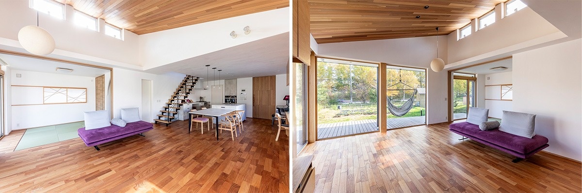 勾配天井に大きな窓を合わせ、空間の広がりを重視したLDK。