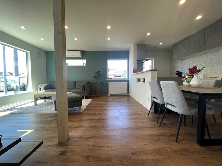 大きな窓を配したLDK・くすみ系のカラー配色で落ち着いた空間に