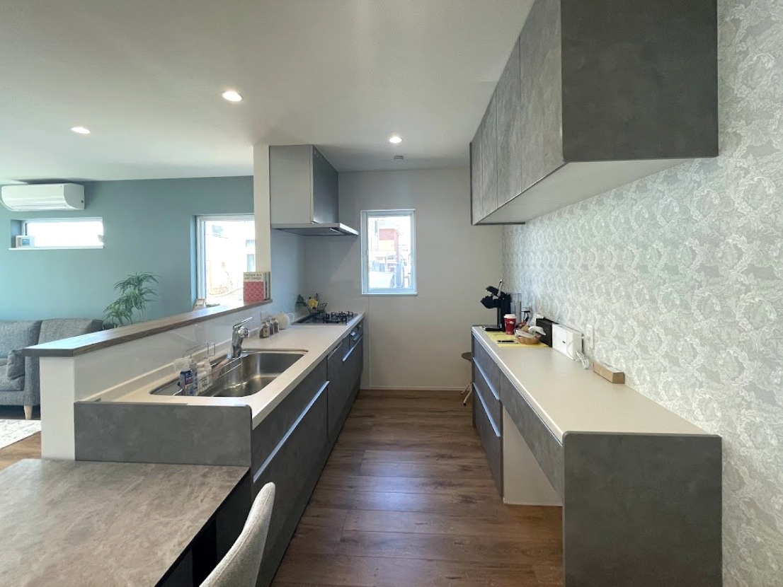 リクシル製の対面キッチンとお揃いの背面収納は、モルタル風の面材が素敵です。通路幅も広く、数人が立って使えるゆったりとしたキッチンです。