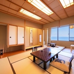 標準客室でも全室オーシャンビューという贅沢な気分に浸れるお部屋は、10畳+4.5畳掘りごたつスペースと、ゆったりとした空間です。
