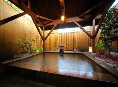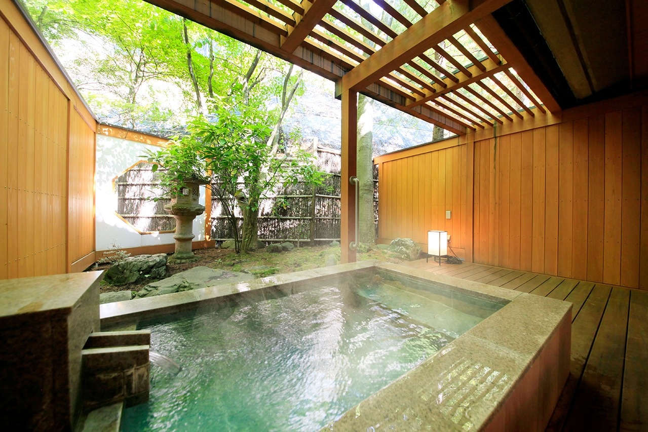 生まれてすぐの赤ちゃんや、肌の弱い方でも安心して入浴のできる、弱アルカリ性の泉質が特徴の温泉は、大浴場のほかに坪庭付や寝湯付の貸切露天風呂も用意されています。