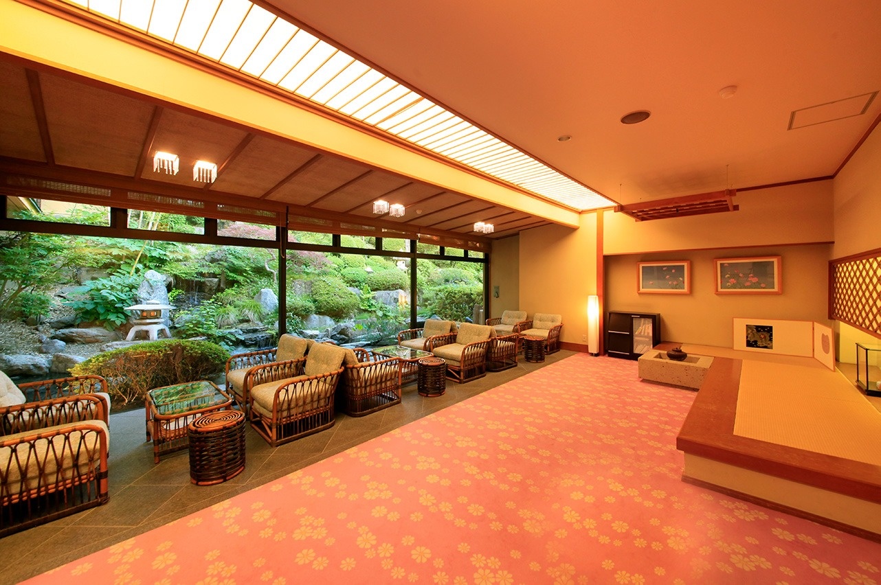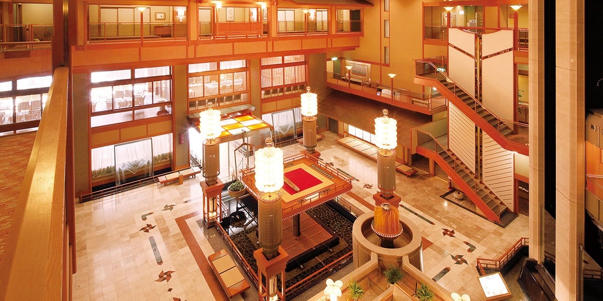華やかで品格のあるロビーを構える「母畑温泉 八幡屋」は、8階建ての吹き抜けで、大きく広々とした旅館です。