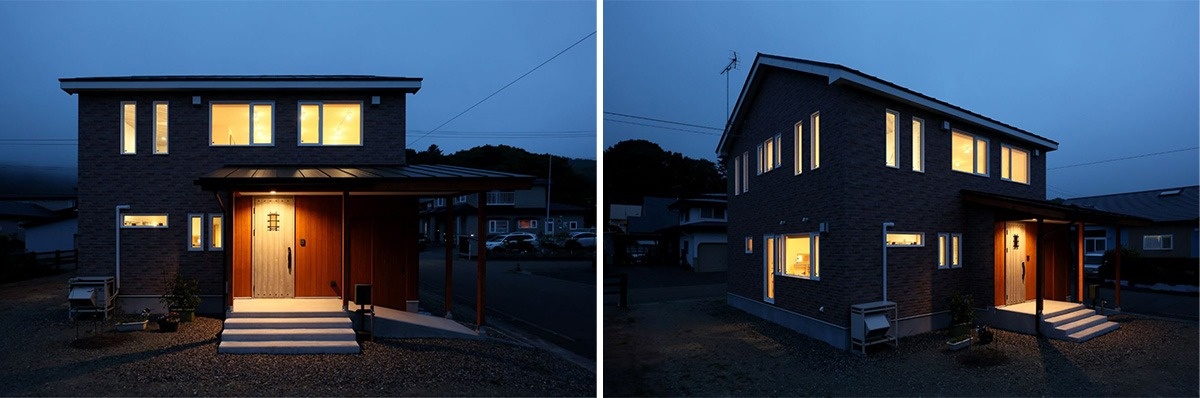 夕暮れの牧草地を背景に浮かび上がる特徴的なシルエット。あたたかな明かりの灯る窓の配置も美しいこの家に暮らすのは、鹿追町で酪農・畑作の混合経営をされているIさんご夫妻です。