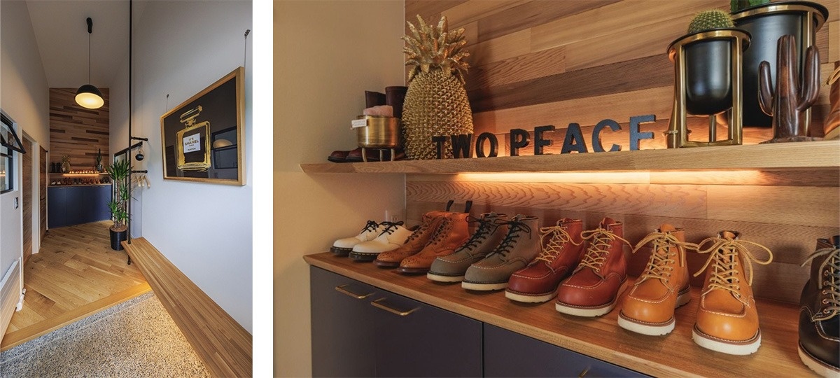 シューズクローゼットの背面はウエスタンレッドシダーの板張りです。「僕も大工さんと一緒に張らせてもらいました。色味を考えて張るのも楽しかったです」(ご主人)