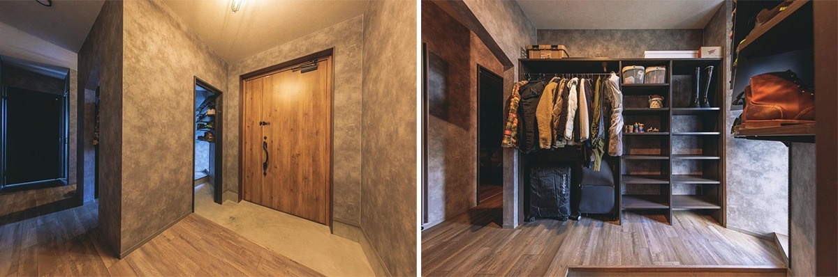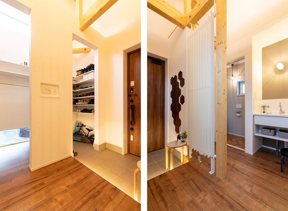 玄関とシューズクローク。内装はコーディネーターの八木睦美さんと決めていきました。フローリングは「列ごとに板の幅が違うデザインが気に入って」選んだフロアタイルです。