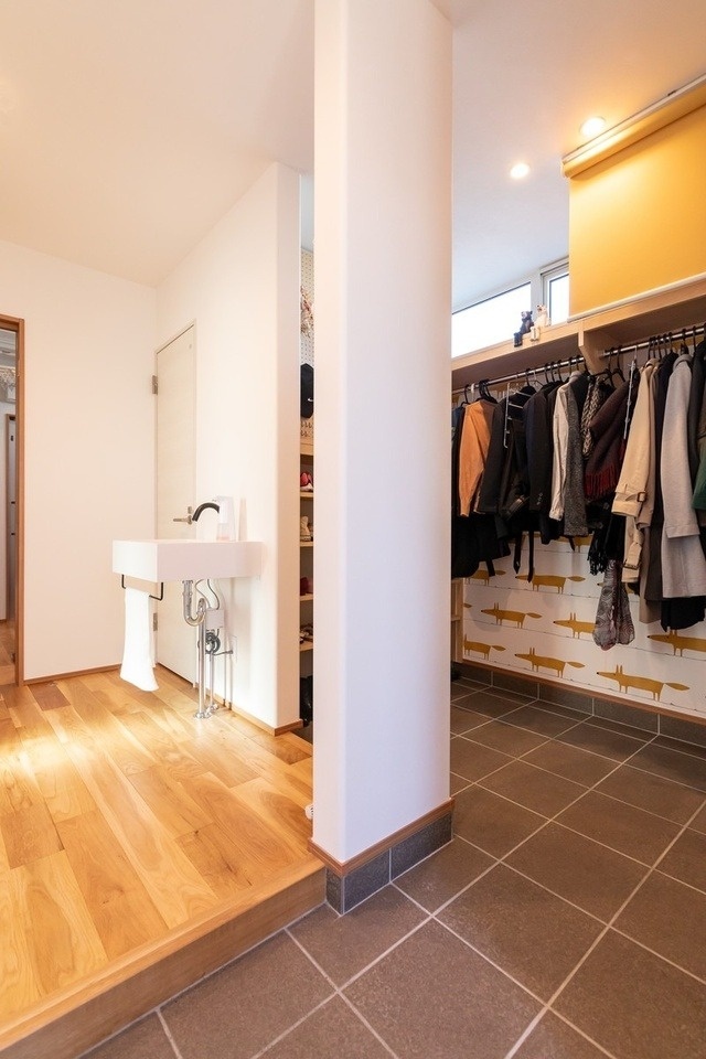 玄関には、外で身につけていた服や物を室内に持ち込まないで済むように、コートやスーツなどをすべて収納できるシューズクローゼットを作りました。キツネのクロスも可愛らしいポイントになっています。帰宅後の感染症対策のため、ホールにも手洗いを設けています。