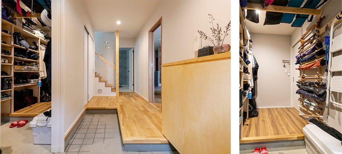 玄関わきにはシューズクローゼットを設けました。片側には家族分の靴が入る棚を造作、もう片側にはハンガーパイプを付けて上着コーナーに。Mさん邸は床暖房を採用していますが、土間にも床暖を通しているので、濡れた上着や靴、ご家族で楽しむスノーボードの用具などもすぐに乾くそうです。