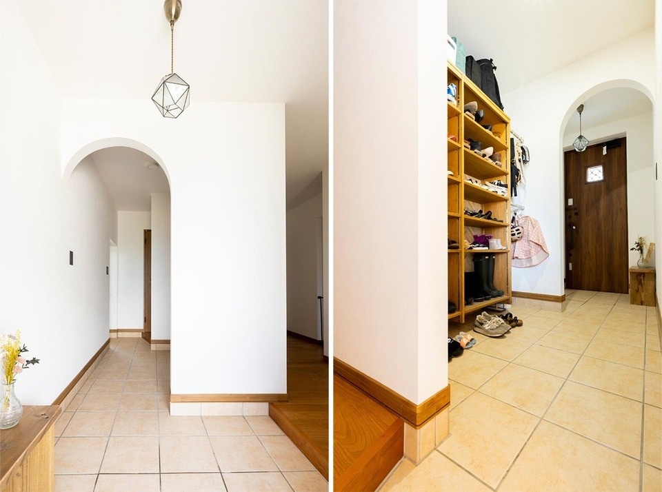玄関は来客用のメイン玄関のほかに、大収納のシューズクローゼットとつながったファミリー玄関も備えています。クローゼット出入り口のアーチの下がり壁はモデルハウスで気に入って採用したデザインです。