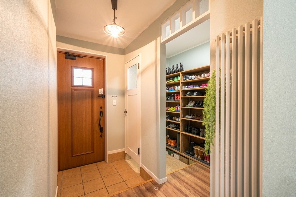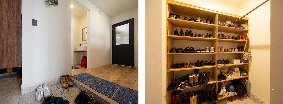 玄関には、収納力バツグンのシューズクローゼットを備えました。「入るかどうかを気にせずにどんどん入れられます」と奥さま。玄関側に扉をつけて、来客からはすぐに中が見えないよう工夫しています。