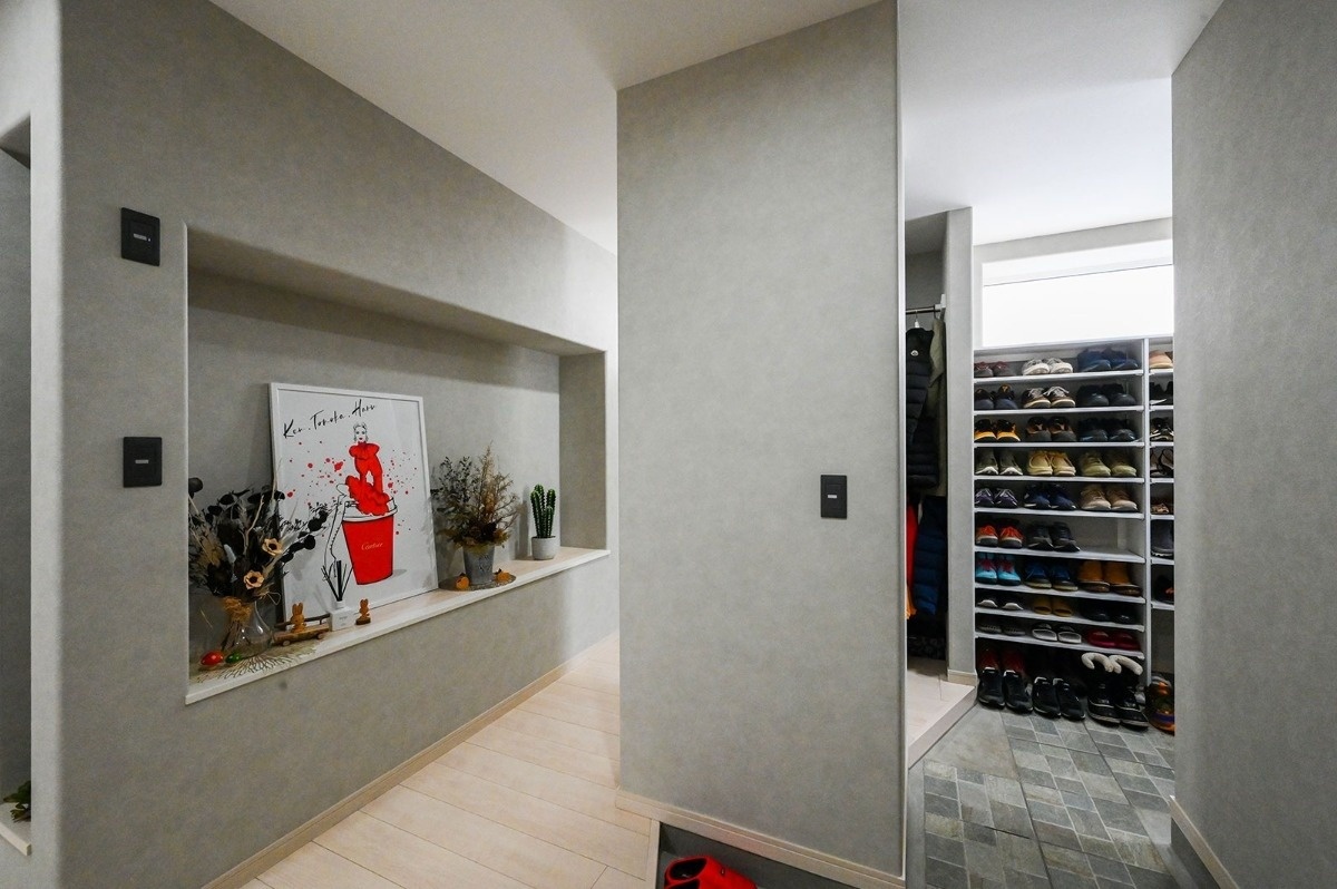玄関は広々とした土間になっています。リビングへと続く手前の壁面は数点のサンプルの中からお選びいただいたタモ材仕上げ。シューズクロークへと続く奥の壁はアクセントクロスで仕上げました。