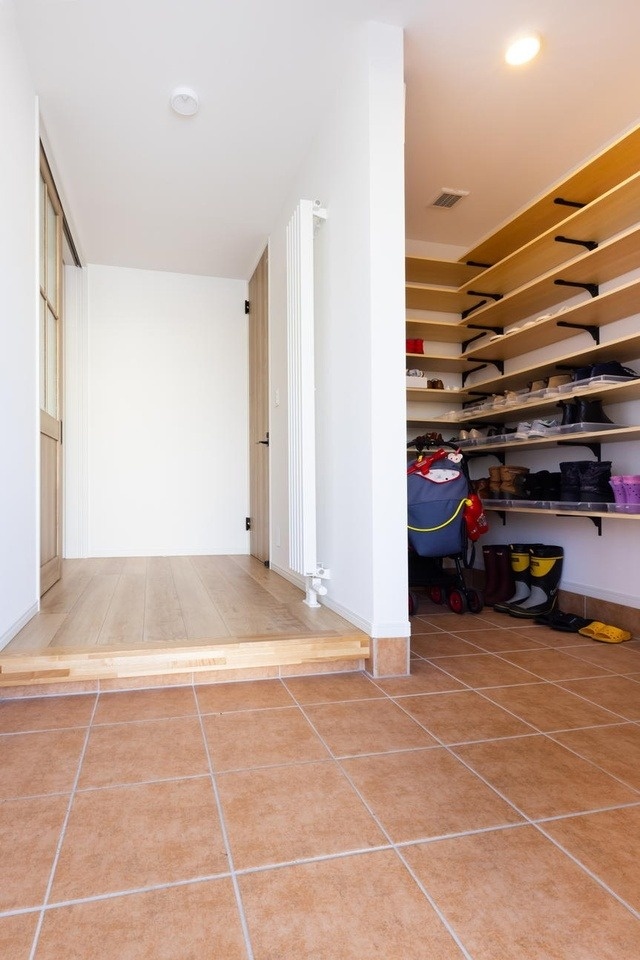玄関はゆとりの広さ。シューズクローゼットには扉がなく、行き来がスムーズです。奥と側面の可動棚、床にスペースがあり、長靴やベビーカーなども余裕で収納できます。