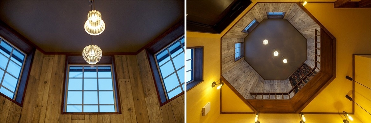 格子の窓にアンティークな照明。吹き抜けを見上げると、塔の中にいる気分です。