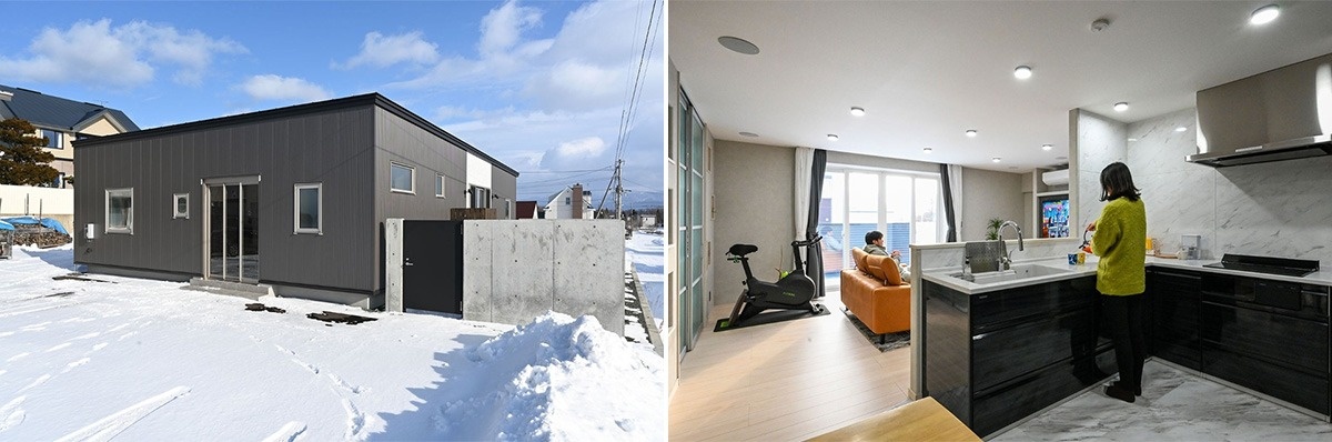 世界遺産の知床を有するオホーツクのまち・斜里町に建つBOX型の平屋。この家は地元で漁師をしている田中さんが、『生活感を感じさせない家』『楽に暮らせる家』をテーマに建てた住まい。光熱費を最小限に抑えられる高い性能を確保したうえで、AV(オーディオ・ビジュアル)システムやキッチンのレイアウト、大きな窓から見える庭、家事が最小限で済む動線などを実現。細部まで田中さんのこだわりが感じることができます。