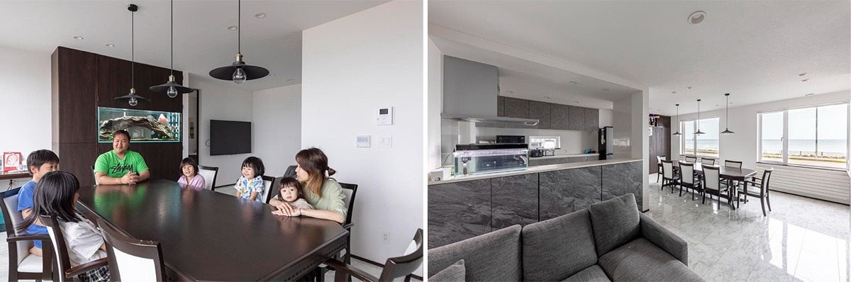 大きいのは水槽や窓だけではありません。ご夫婦と子ども5人、合わせて7人が全員で夕食を囲めるダイニングテーブルが置ける大きなダイニングもあります。ご主人は「漁が朝早いので、家族全員が揃うのは晩御飯の時間だけ。その時だけは家族皆揃って過ごしたいのでリビングよりダイニングを大きく確保したんです」と話してくれました。