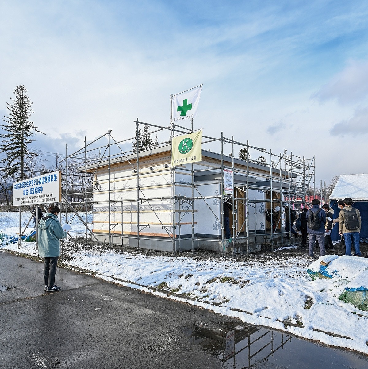 道内で自然災害が発生した時に、地域の力を結集した木造応急仮設住宅を供給しようと、現在、道や道総研・北総研、全国木造建設事業協会北海道協会(北海道ビルダーズ協会及び全建総連北海道建設労働組合連合会)などが協力し、「2021年度木造応急仮設住宅モデル実証実験事業」として、十勝・清水町で実証モデルの建設を進めている。