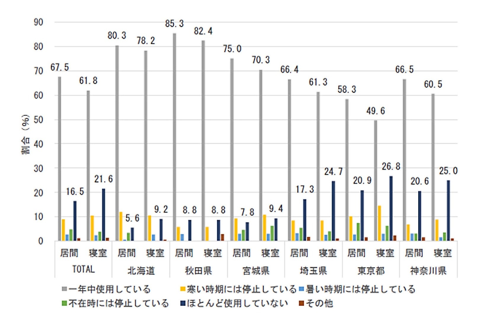 新築住宅に住んでいる人を対象とした調査なので、全て24時間換気が設置されていますが、『常時運転する必要はないと思っていた』『窓開け換気もするから』と思っていた人がいるようです。さらに、『年中ほとんど運転しない』と答えた人の比率は、首都圏で約20%、北海道でも約6%ありました。最近の高断熱・高気密住宅では、換気装置の運転が止まると気密性が高いために空気の入れ換えが行われず、汚染された空気が住宅内に拡散される危険性が大きくなります」と心配しています。