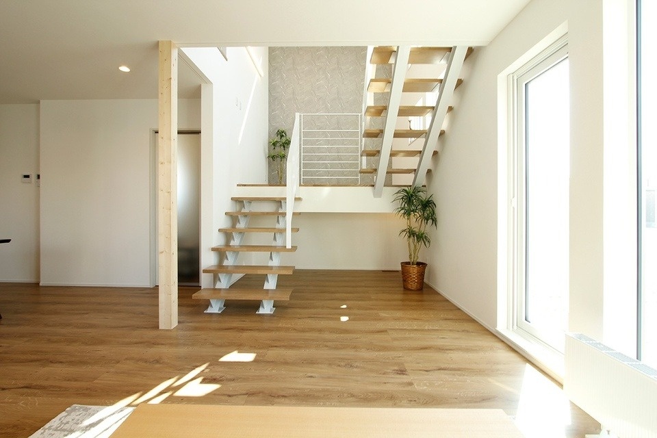 このモデルハウスは延床面積が約31坪。特に札幌圏は土地価格が高騰している中、限られた面積の中で、いかに快適な暮らしを実現するか、その選択肢の1つとしてスキップフロアになっています。リビング階段の右横には、ダウンフロアになった部屋が見えます。