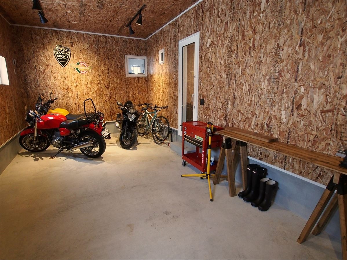 広いガレージスペースのなかには、磨き込まれたKさんのバイク、イタリアのDUCATI(ドゥカティ)とMOTO GUZZI(モト・グッツィ)がありました。ガレージの奥行きは7mと広く、車も1台止められます。インテリアはKさんが自作。家づくりは終わっていないのです。ガレージの奥には、クロークのある玄関に直結したドアもあるので、スムーズに室内へ移動できます。