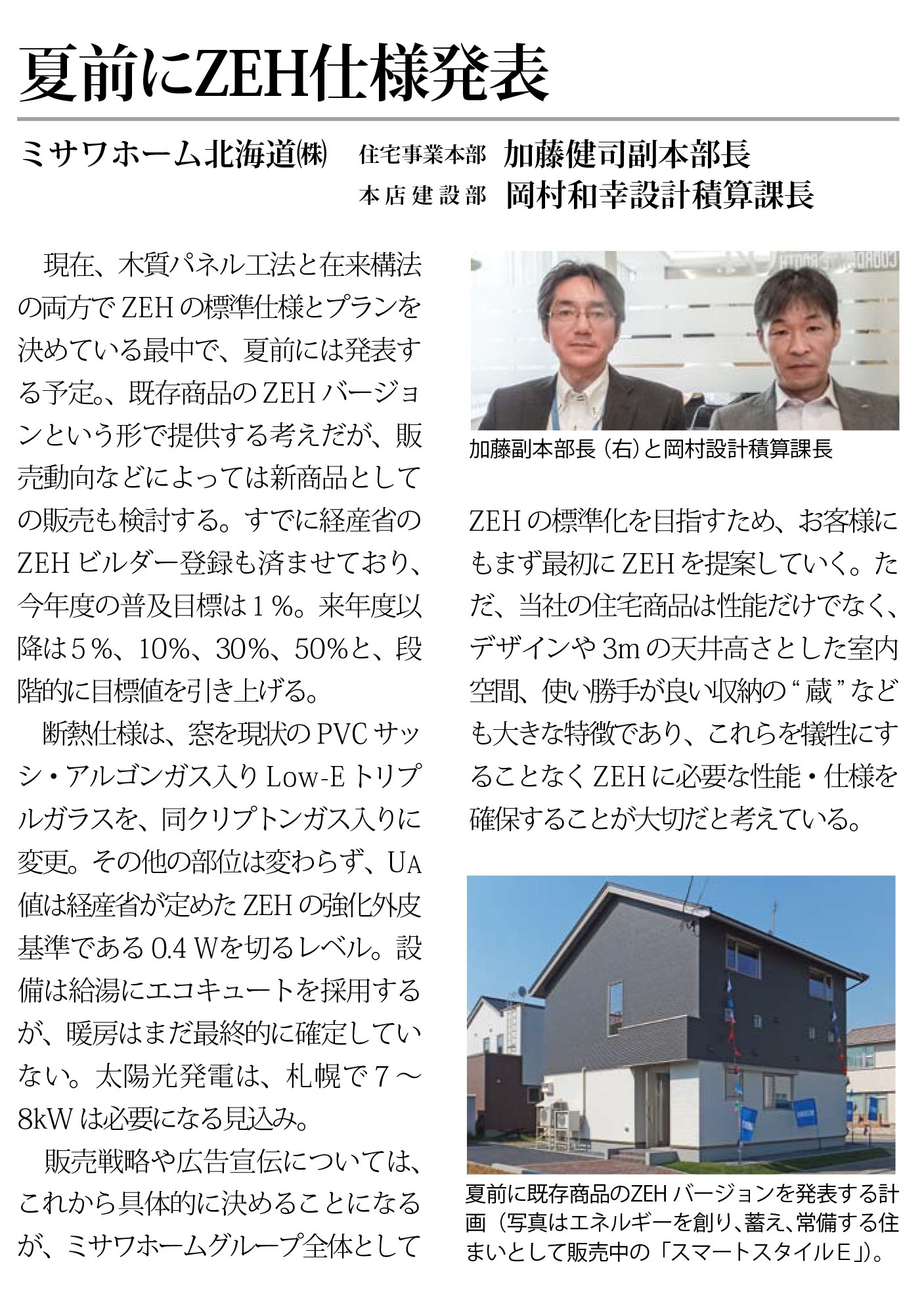 2016年6月5日 北海道住宅新聞4面記事 夏前にZEH仕様発表 ミサワホーム北海道㈱ 住宅事業本部 加藤健司副本部長 本店建設部 岡村和幸設計積算課長
