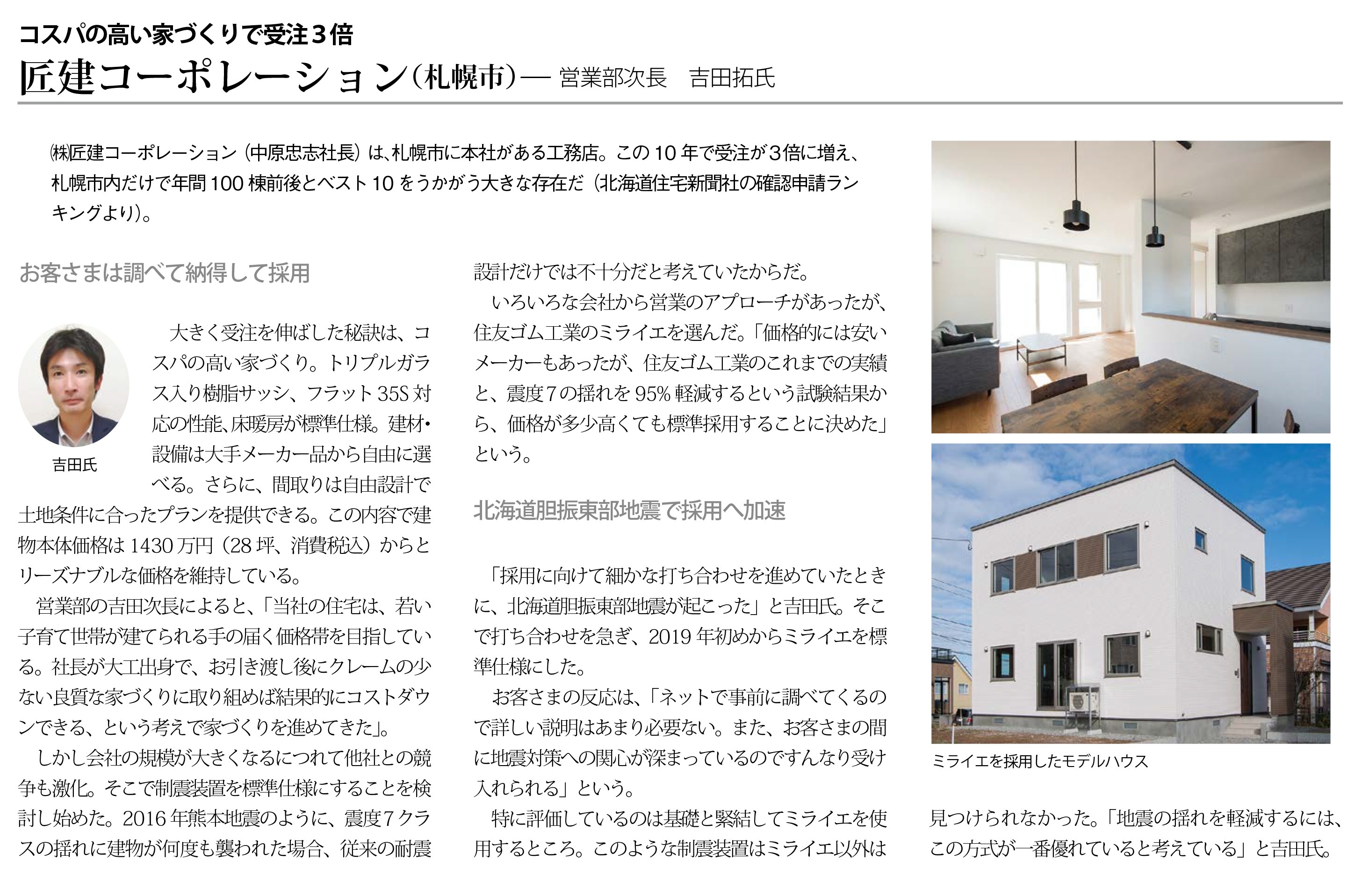 2022年1月15日 北海道住宅新聞9面記事 コスパの高い家づくりで受注3倍 匠建コーポレーション(札幌市)――営業部次長 吉田拓氏