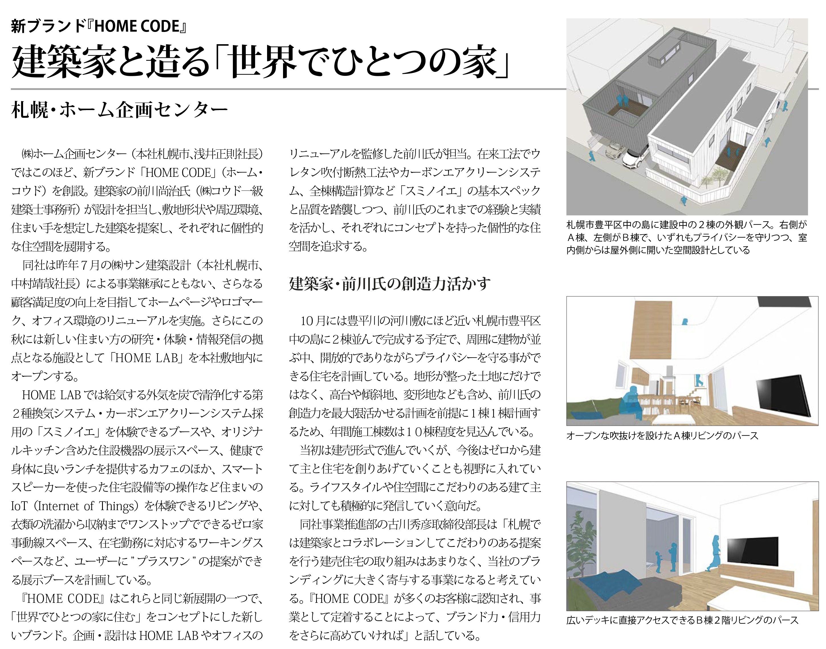 2021年7月25日 北海道住宅新聞4面記事 新ブランド『HOME CODE』 建築家と造る「世界でひとつの家」