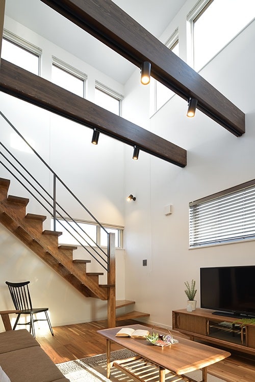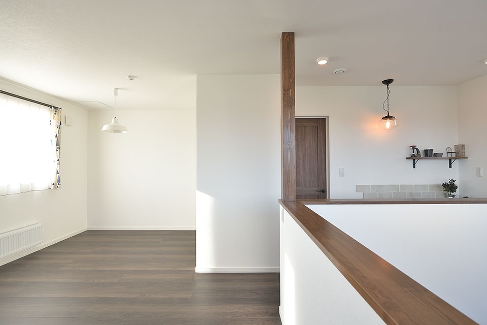 リビングは吹き抜けで上階の窓からも光が入り、明るく開放的な雰囲気です。またオープン階段があるので、学校から帰ってきたお子さんが子ども部屋に上がる様子がキッチンから見えます。キッチンからはユーティリティーや1階の洋室も見えるので、お子さんがどこにいても気配がわかって安心。ママ思いのプランニングです。