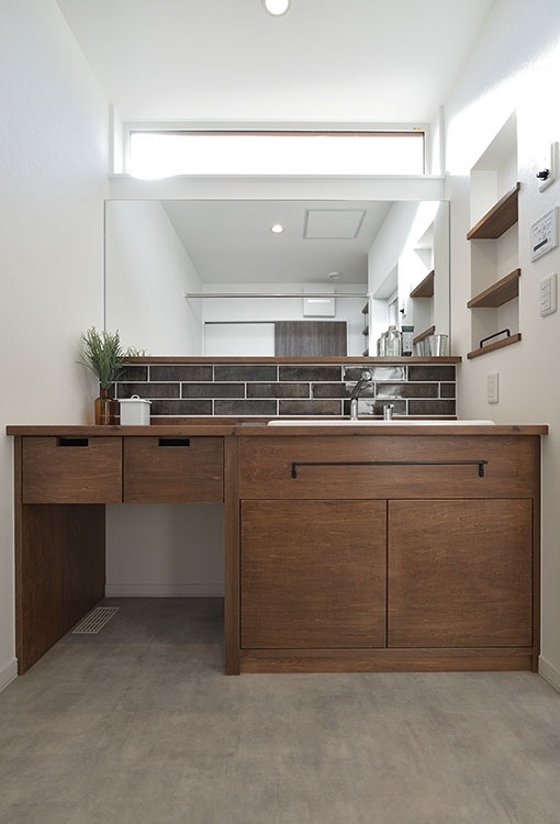 ユーティリティーには、造作の洗面化粧台があります。落ち着いたグレーのタイルが目を惹きます。ゆとりあるサイズで、鏡も幅いっぱい使っているので、忙しい朝の時間も2人同時に身支度ができそうです。既製品にはない使いやすさとデザインを両立させました。
