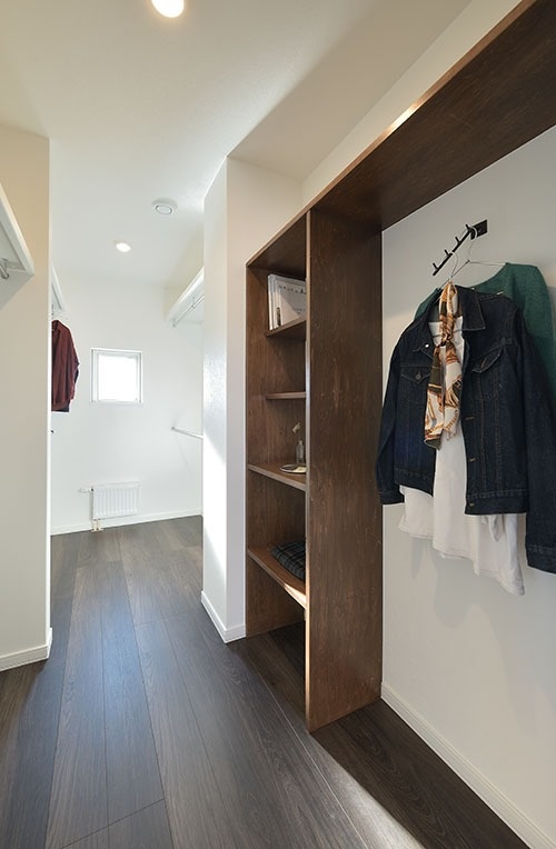 右手にある主寝室は、奥のウォークインクローゼットに工夫をしました。4畳と通常よりも広くしており、そのうちの一部をディスプレイスペースにしています。セレクトショップのように、お気に入りの服や雑貨を飾って楽しむことができます。ファッション好きなお客さまを想定した提案です。