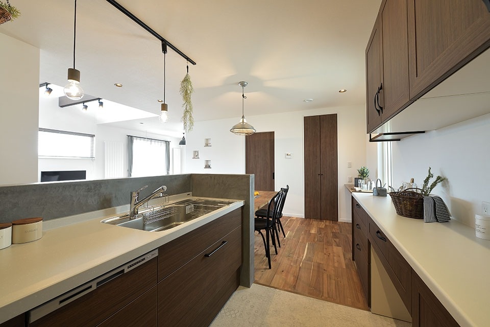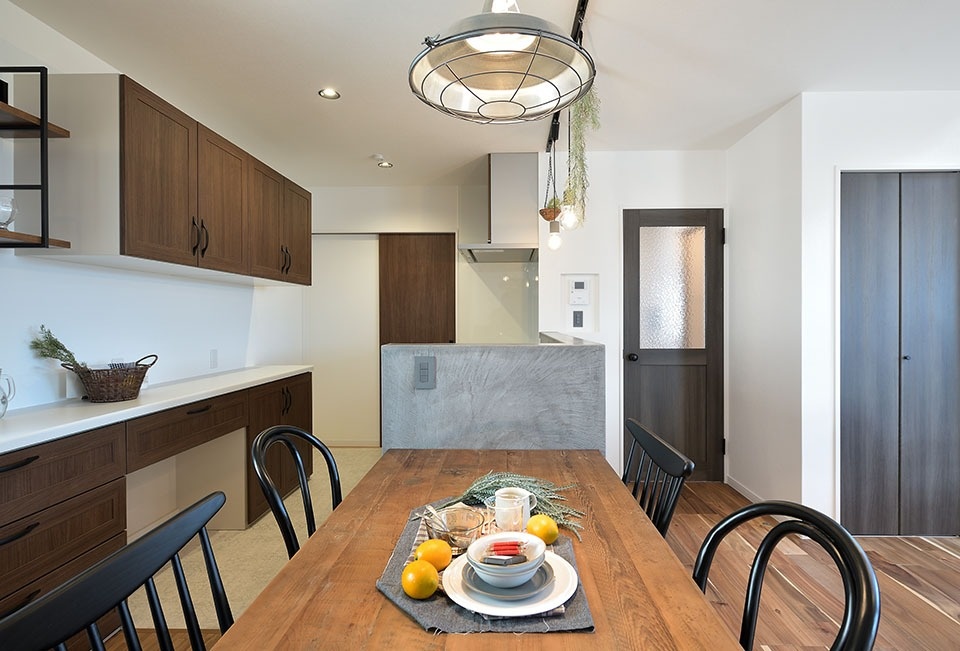 ダイニングは、キッチンの真横に設置。キッチンから配膳までの動線が短く、後片付けもしやすいのが特徴。イスの背後も十分なスペースがあり、使いやすそうです。キッチンには飾り棚を見せる収納として使って、毎日の食事時間をより楽しくする工夫も。