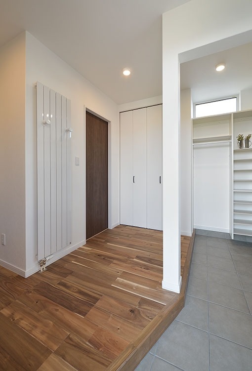 来客は、玄関から手前の通路を通ってそのままリビングへ行くことができます。玄関からLDKへの動線を2通り確保することで、ゆとりのある空間を実現し、片付け・収納しやすいプランになりました。