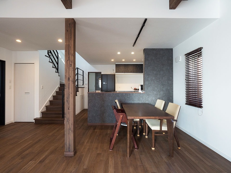 約22畳大のリビング・ダイニング。当初吹き抜けリビングを希望していたFさんでしたが、上部に部屋がつくれないのは勿体ないと感じ、佐藤代表に相談したところ、実現したのが通常よりも60cmも高い3mの天井でした。リビングの上階には個室が配置されているため、先の外観写真のように屋根の高さが変わりました。