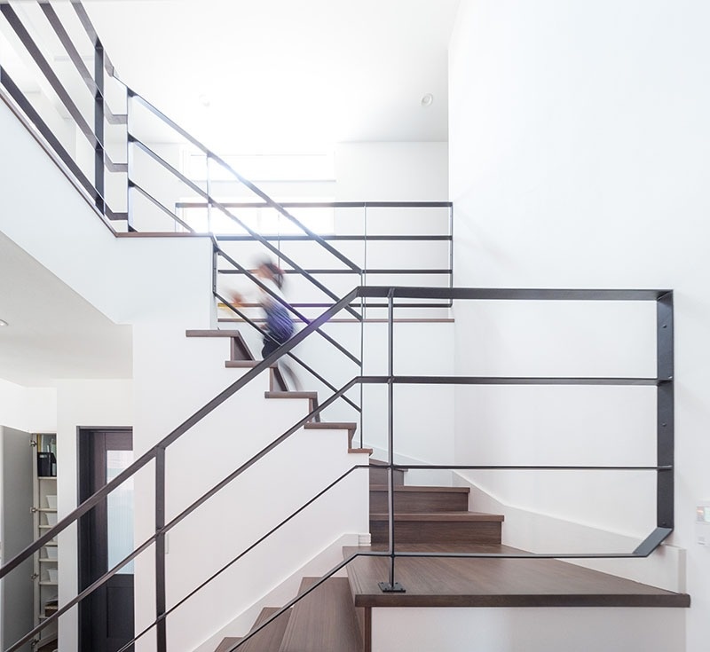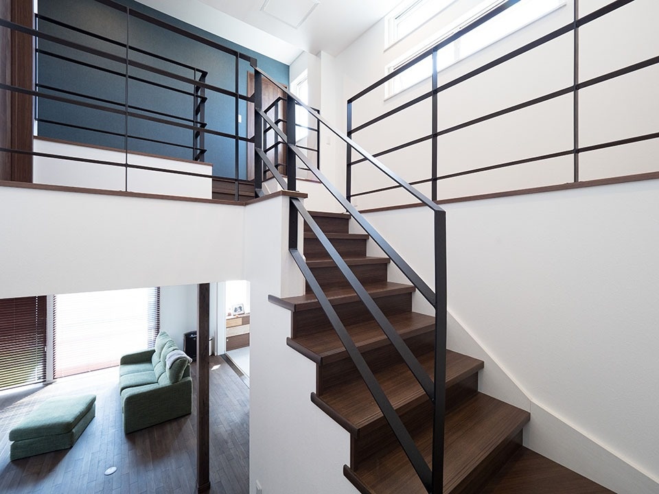 キッチン横のリビング階段には奥さまの希望で造作のアイアン手摺を採用。スッキリとしたデザインは、お子さまの様子を見守ることができて安心です。