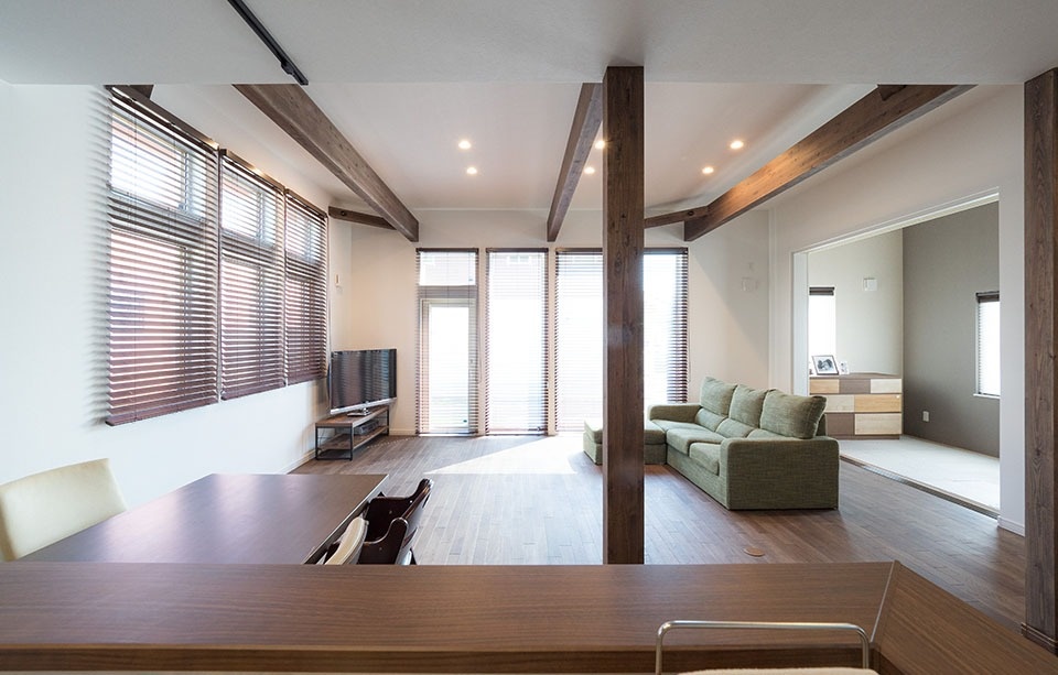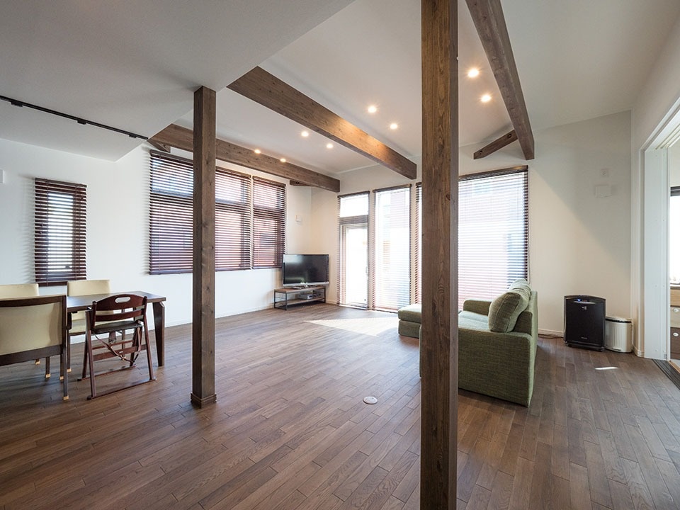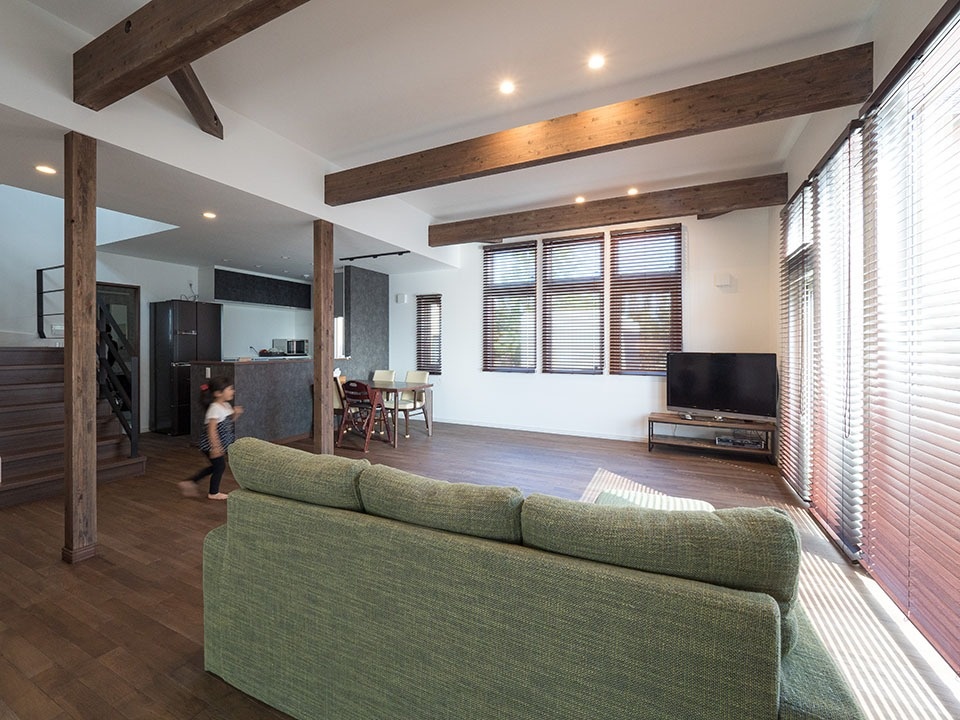 柱と柱の間に見えるソファ手前の床面にある小さな円形の蓋は、ご主人が希望された開閉式のコンセント。「リビングが広いので、スマートフォンを充電するにもコードの長さが足りないと思い、こんなの出来ないかと社長に相談したんです。事務所などで使われるもののようですが、使う時だけ出せるので、スッキリとしているし便利ですよ」とご主人。
