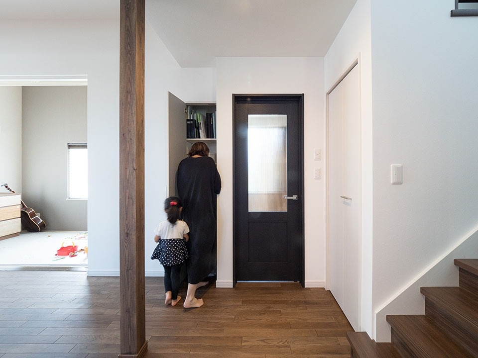 スッキリと片付いた広々空間の理由は各所に設置された便利な収納も理由の1つ。リビングドア横の収納は旦那さまの希望で付けた書類収納庫。また、写真にはありませんが、2階主寝室には高身長の旦那さまに合わせた特注サイズのクロゼットがあったり、目的に合わせた細かな工夫が住みよい空間づくりにつながっているようです。