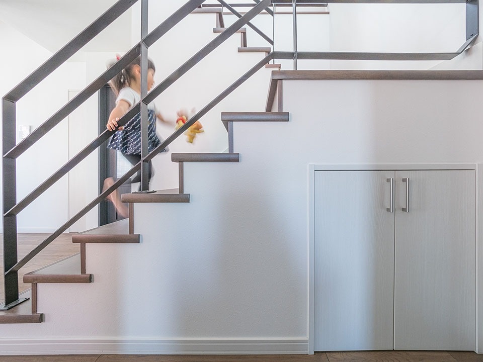 かね折れ階段の踊り場は丁度キッチンに立つママの目線ともピッタリな高さ。Mちゃんのママを呼ぶ声が今にも聞こえてきそうです。