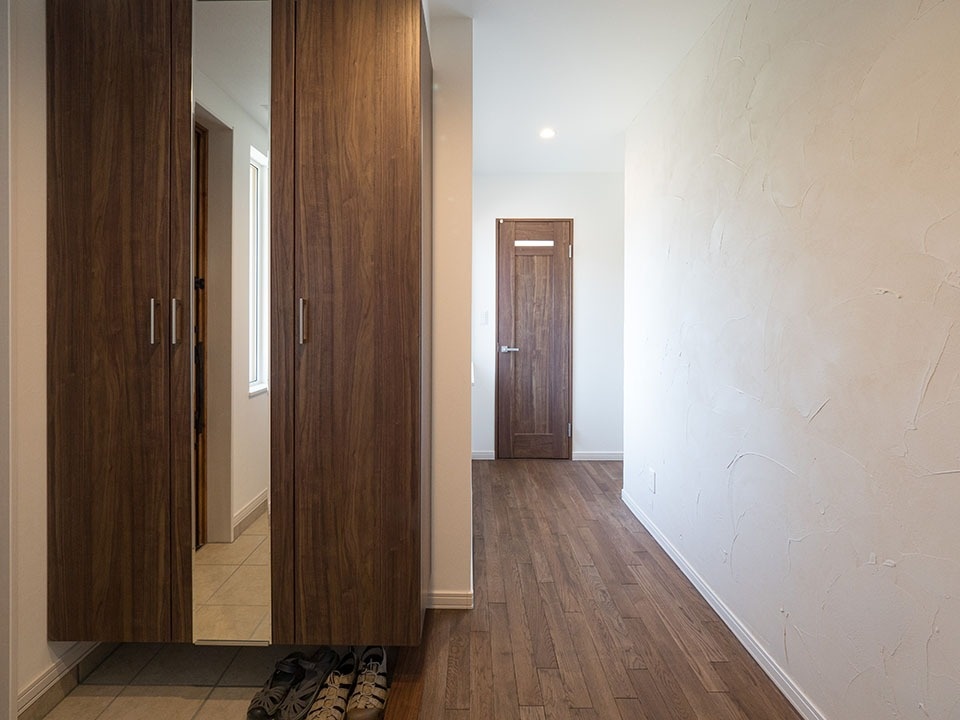 玄関ホール。壁にはクロスを使わず、稚内産の珪藻土入りの左官材を使用。吸放湿性と消臭性に優れた天然素材だから、冬場の過乾燥の抑制や消臭効果が期待できます。