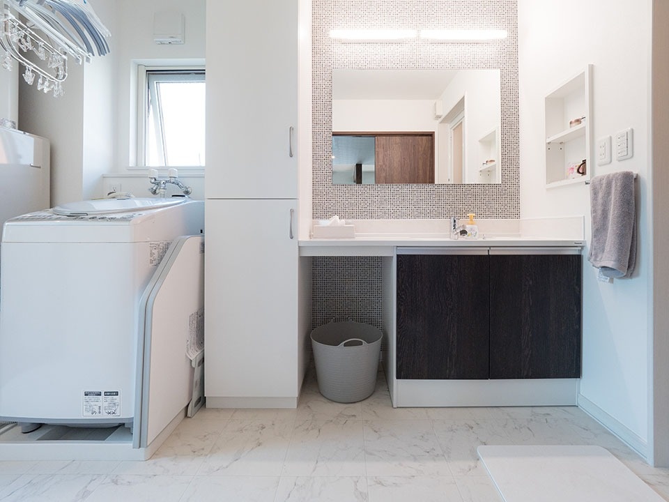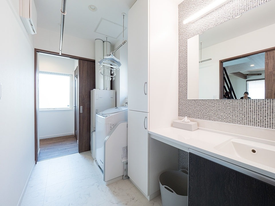 キッチンと回遊式につながるユーティリティー。大人が二人並んで使えるよう、洗面化粧台は約135㎝幅のゆったりサイズになっています。鏡も特注。照明は、当初のプランでは1つだったところ、明るさを心配した現場の棟梁のアドバイスで2つに増やしたそうです。「タオルハンガーひとつでも、一番使いやすい位置を考えて提案してくださり、実際に現場でいただくアドバイスは本当に助かりました」と奥さま。